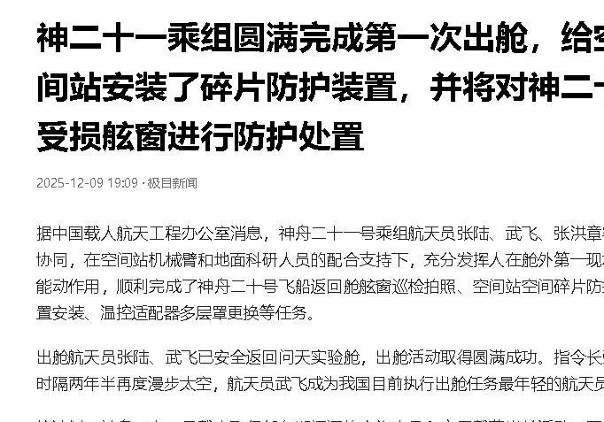 12月9日中国空间站传来重磅音问:神舟二十一号乘组航天员历经8个多小时的高强度功课,圆满完成初度出舱任务!